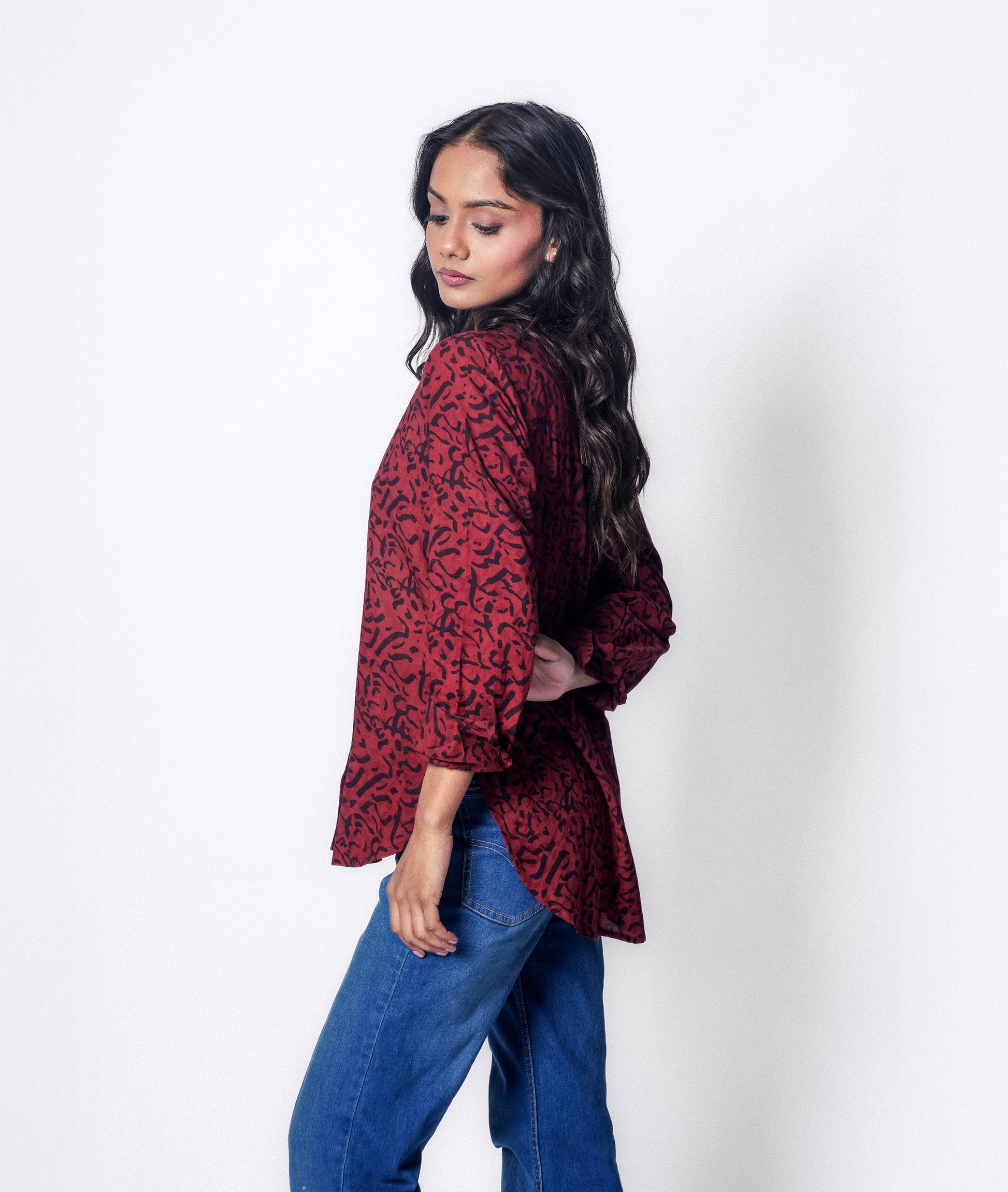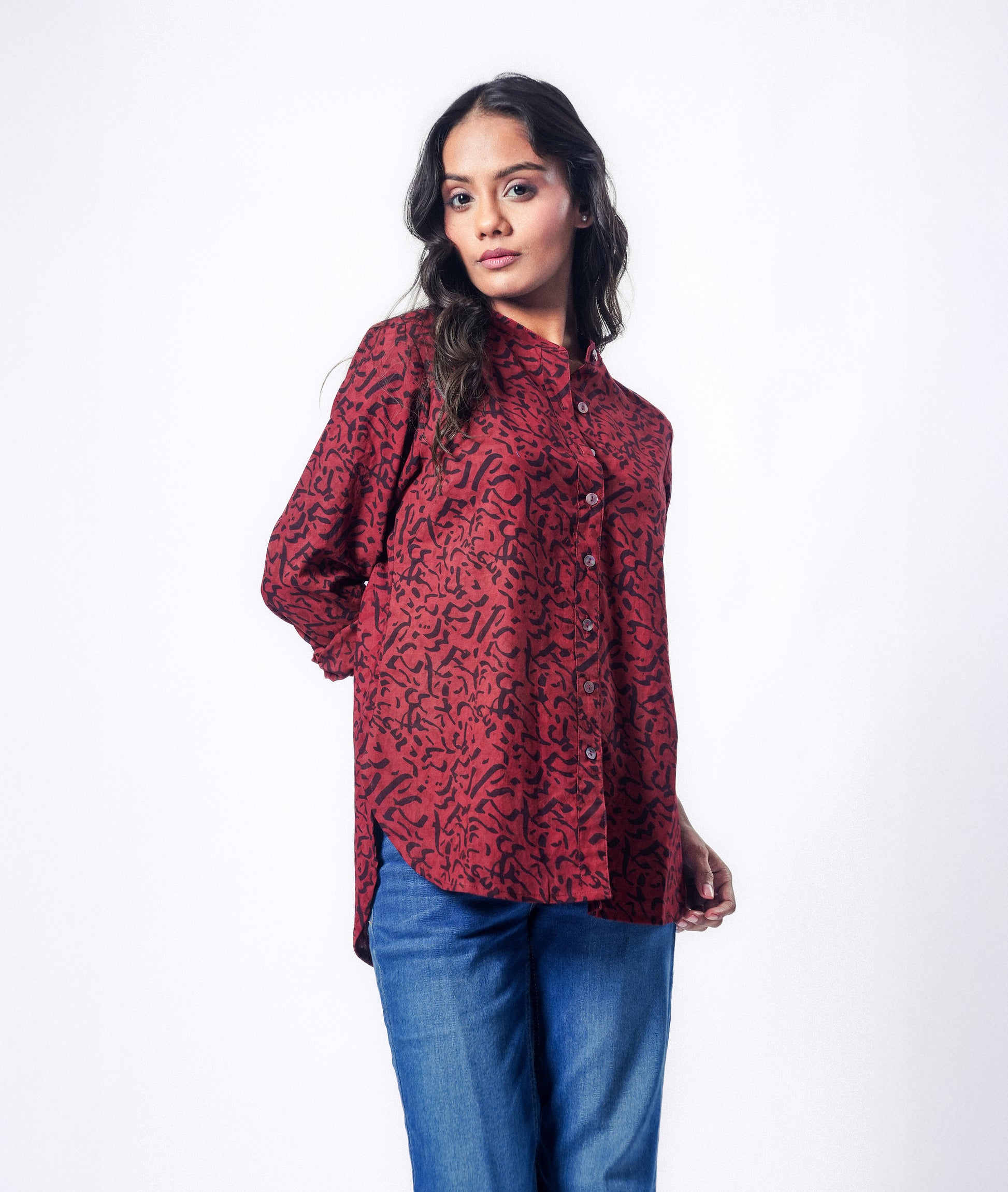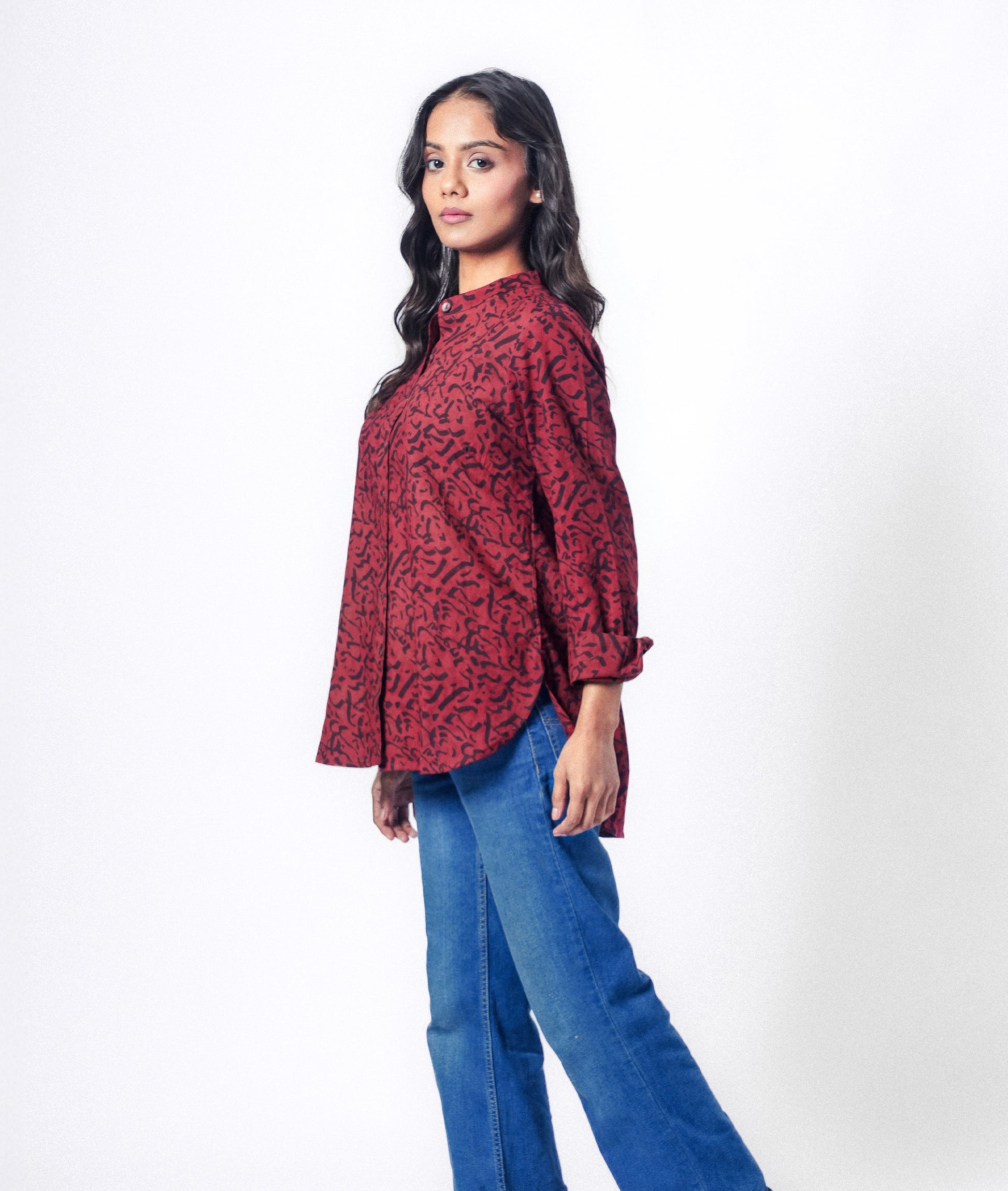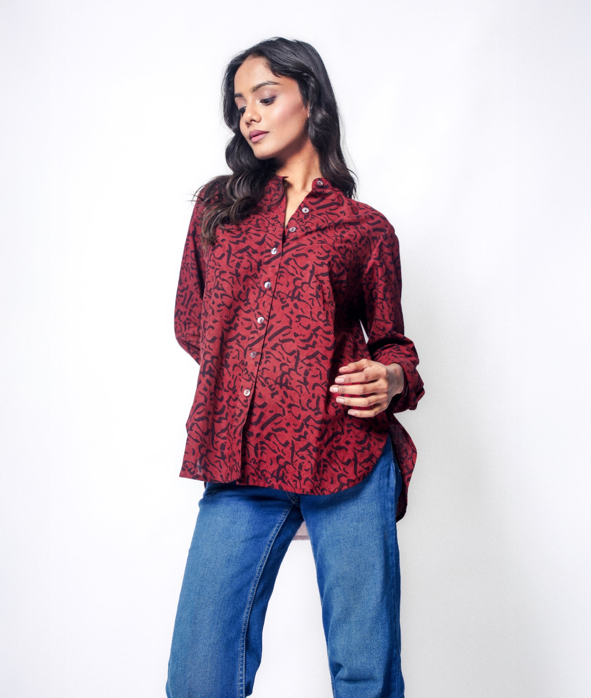 The Michi shirt reflects movement, intention, and direction. It’s a relaxed fit, featuring a low sitting mandarin collar and narrow cuffs and a high low curved hem. Its for the ones who walk their own way, calmly and consciously.